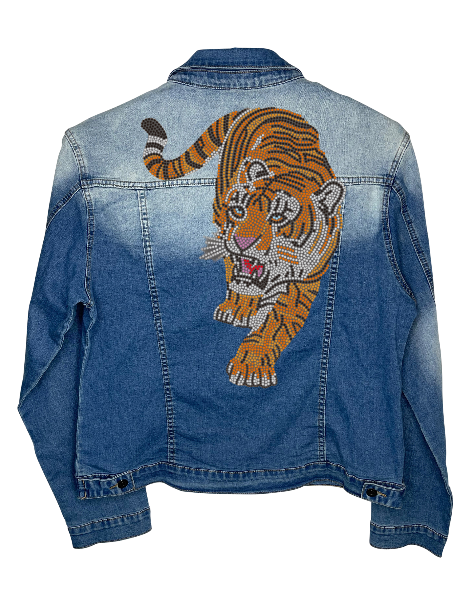 Complete your look in our denim jacket with crystal walking tiger design. Crafted from a lightly faded and stretchy medium wash denim, this jacket is perfect for any occasion. Add a touch of fun to any outfit!