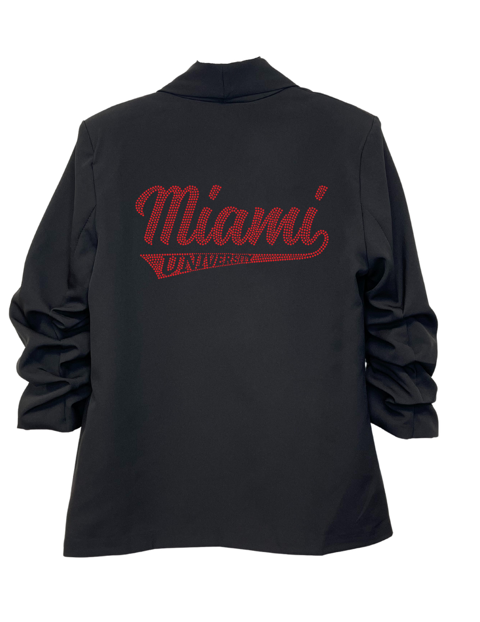 This black blazer is a modern take on a classic style. Ruched sleeves give it a sophisticated look, while our Miami of Ohio design adds a unique touch. Bring a dash of shine and flair to any ensemble with this beautiful blazer.