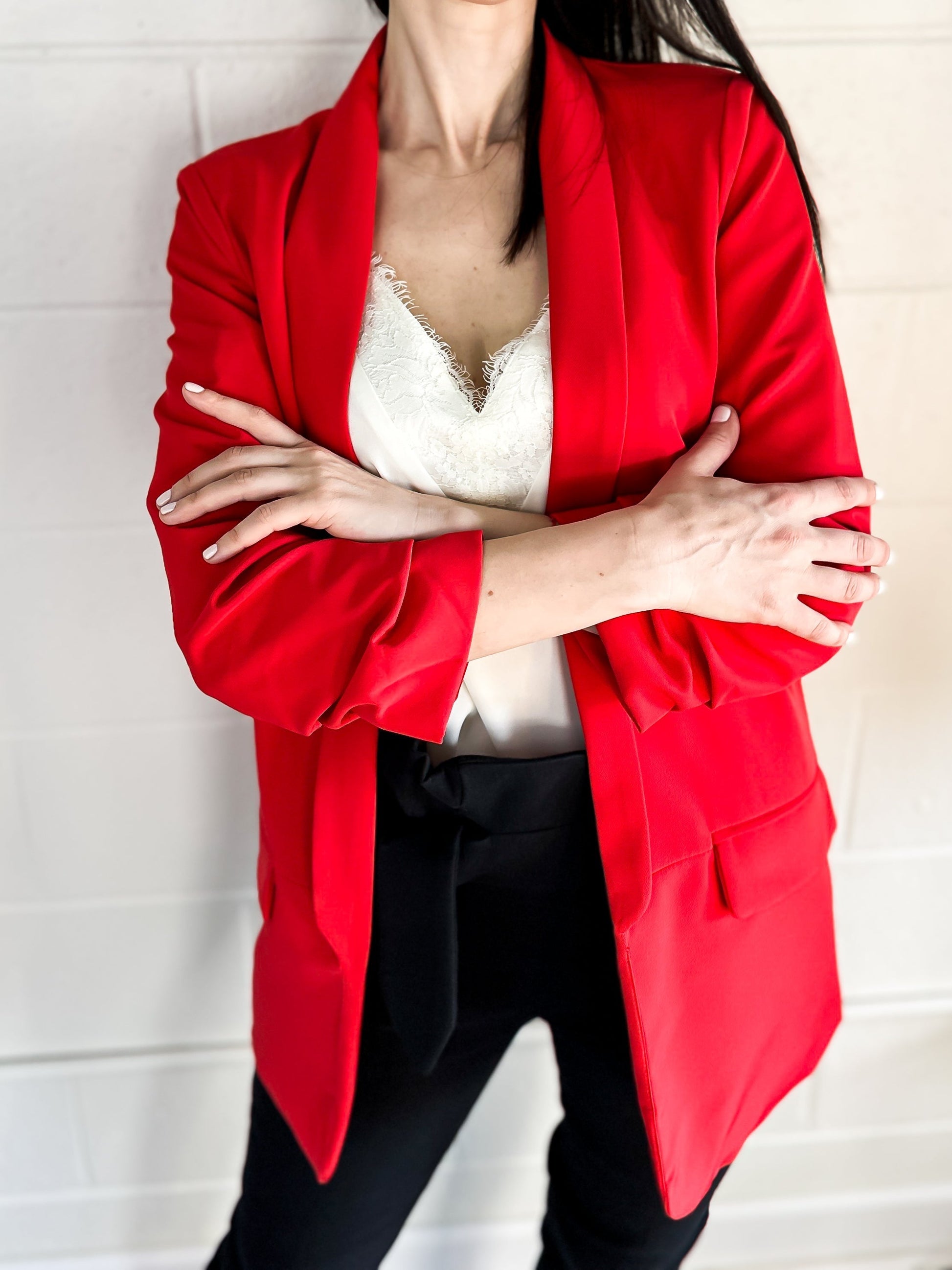 This red blazer is a modern take on a classic style. Ruched sleeves give it a sophisticated look, while our crystal Texas Tech Wreck 'em Tech Guns Up design adds a unique touch. Bring a dash of shine and flair to any ensemble with this beautiful blazer.