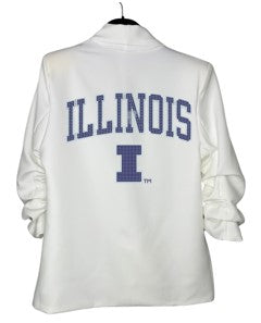 This white blazer is a modern take on a classic style. Ruched sleeves give it a sophisticated look, while our crystal University of Illinois design adds a unique touch. Bring a dash of shine and flair to any ensemble with this beautiful blazer.